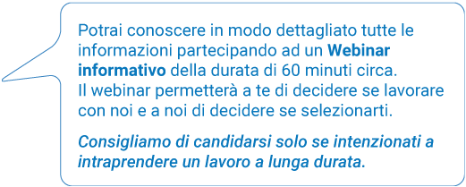 Potrai conoscere in modo dettagliato tutte le informazioni partecipando ad un Webinar informativo della durata di 60 minuti circa. Il webinar permetterà a te di decidere se lavorare con noi e a noi di decidere se selezionarti.